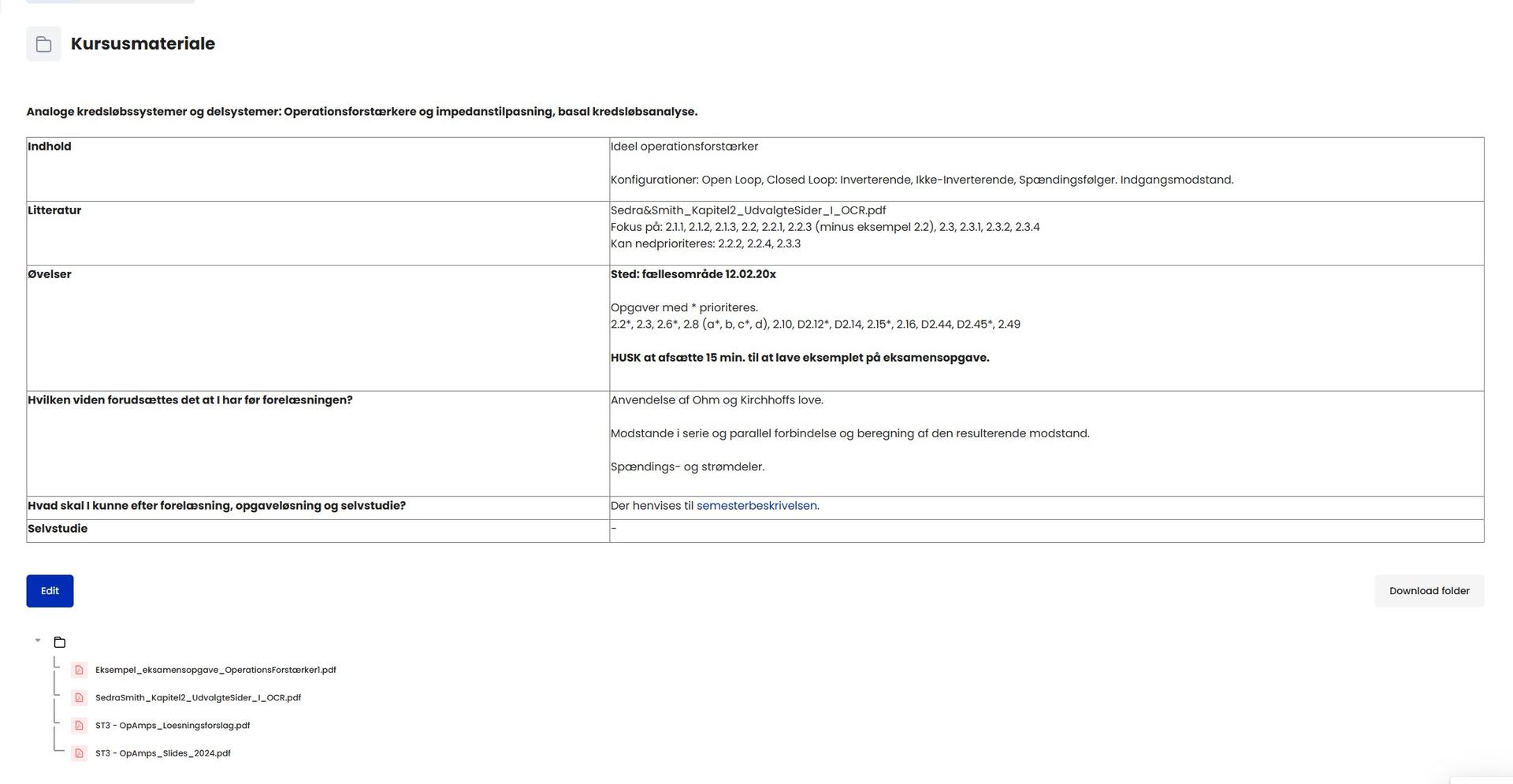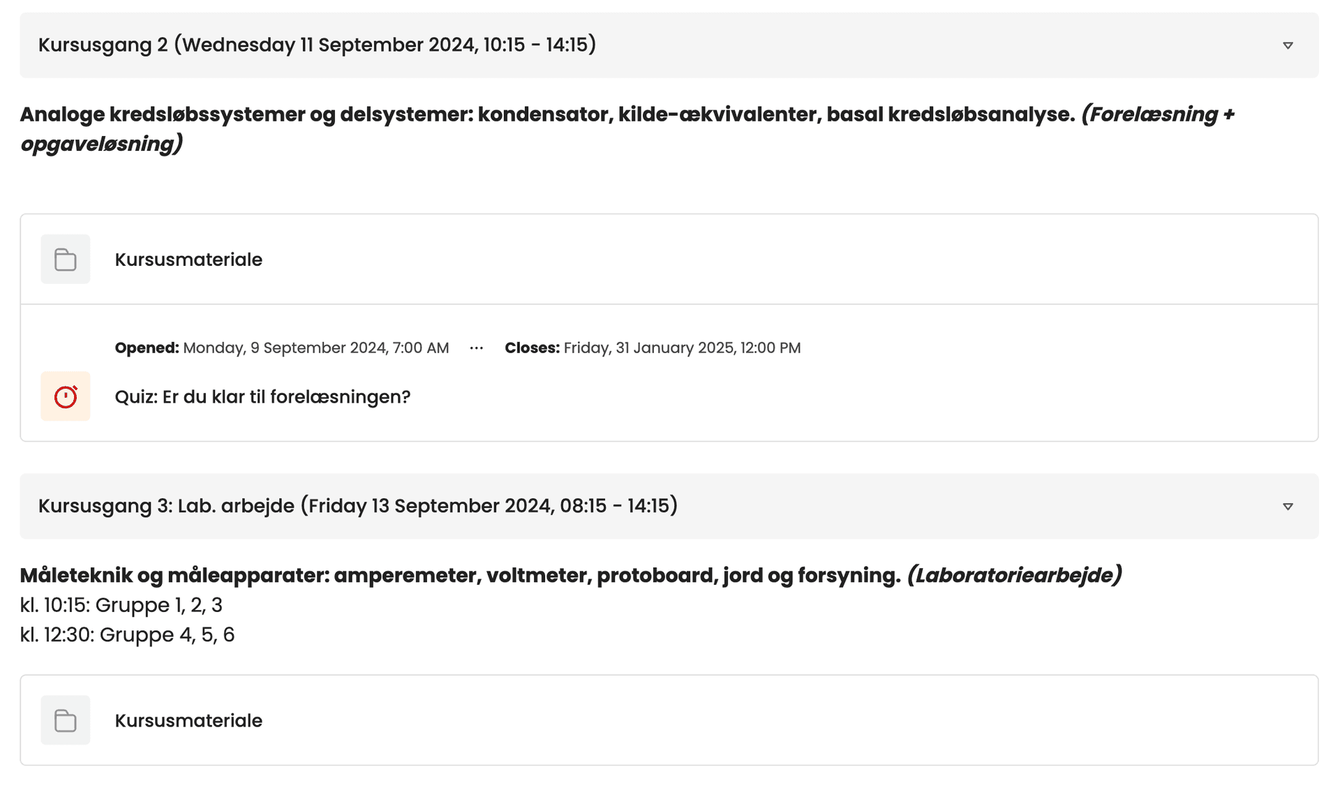 Moodle is organised with a very fixed structure. For each teaching session, there is a folder containing course material, and if the session is a lecture, a quiz is also included. The structure can be seen in the image below.